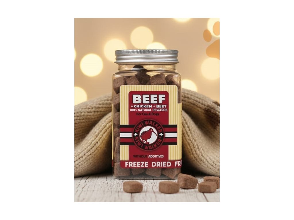 Mrazem sušená hovězí játra, hovězí, kuře, červená řepa jsou ideální pamlsky pro psy a kočky od značky Kiwi Walker