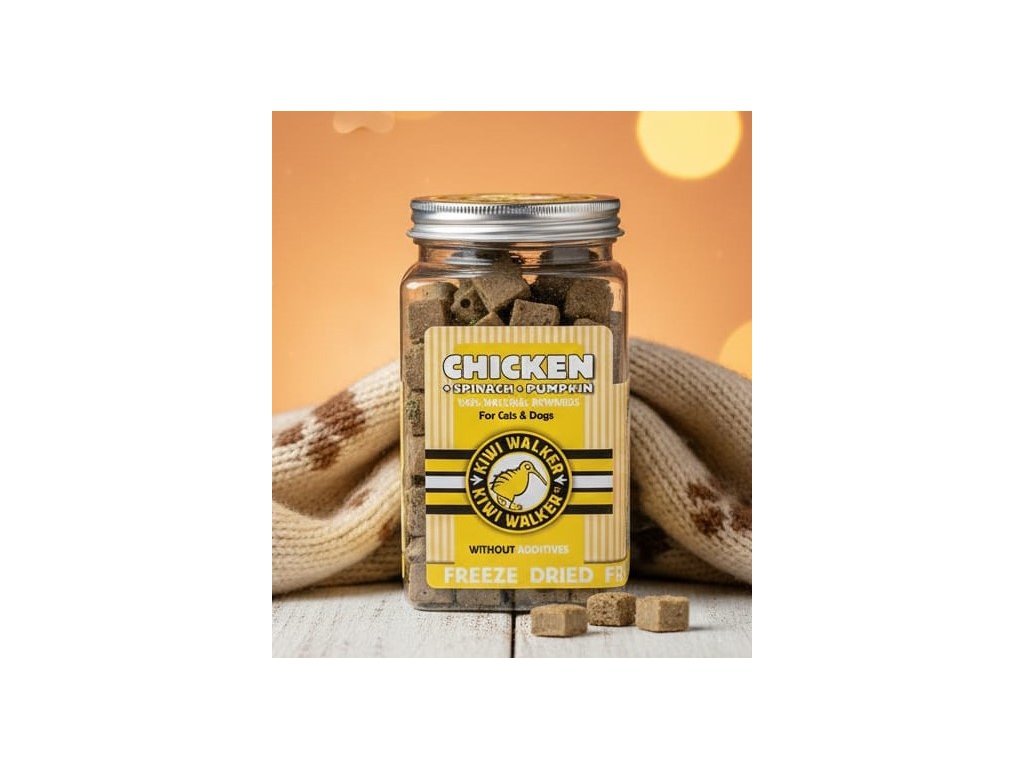 Mrazem sušená kuřecí játra se špenátem a mrkví jsou ideální pamlsky pro psy a kočky od značky Kiwi Walker