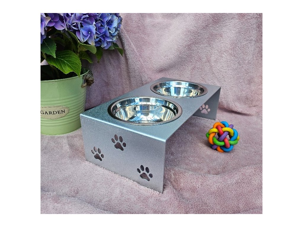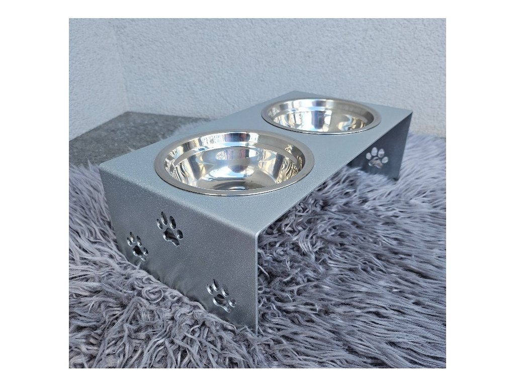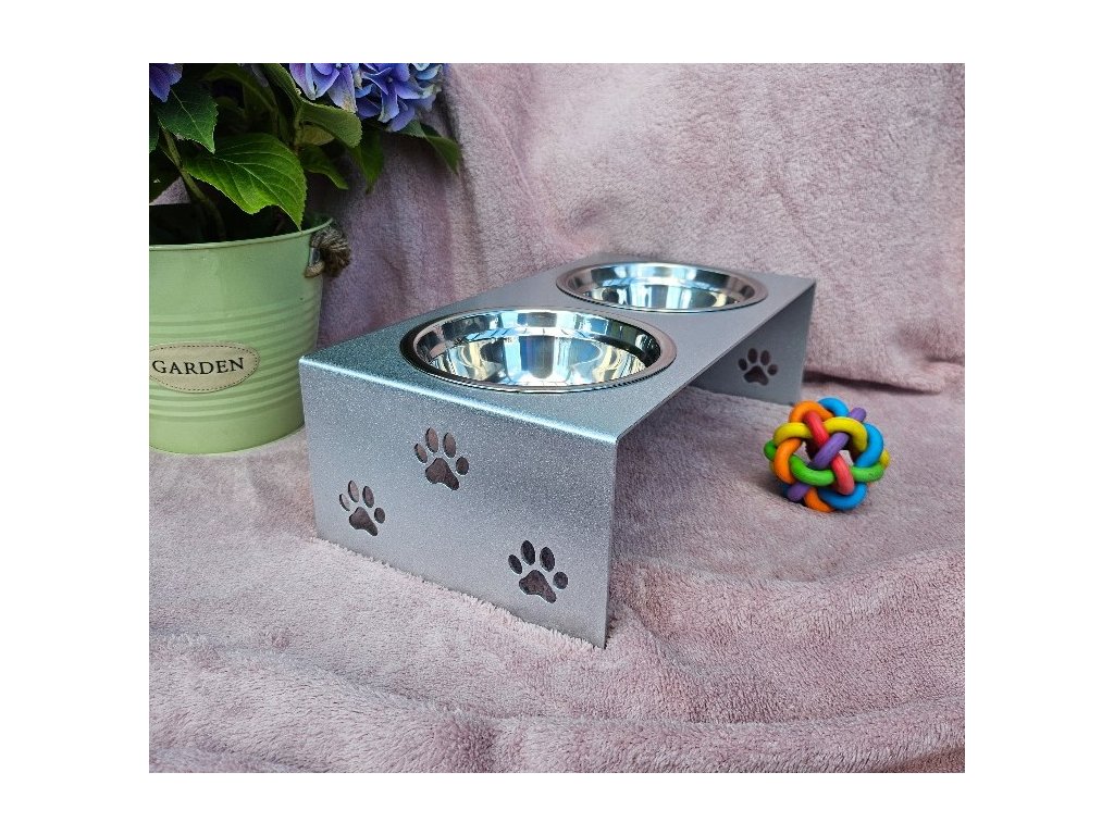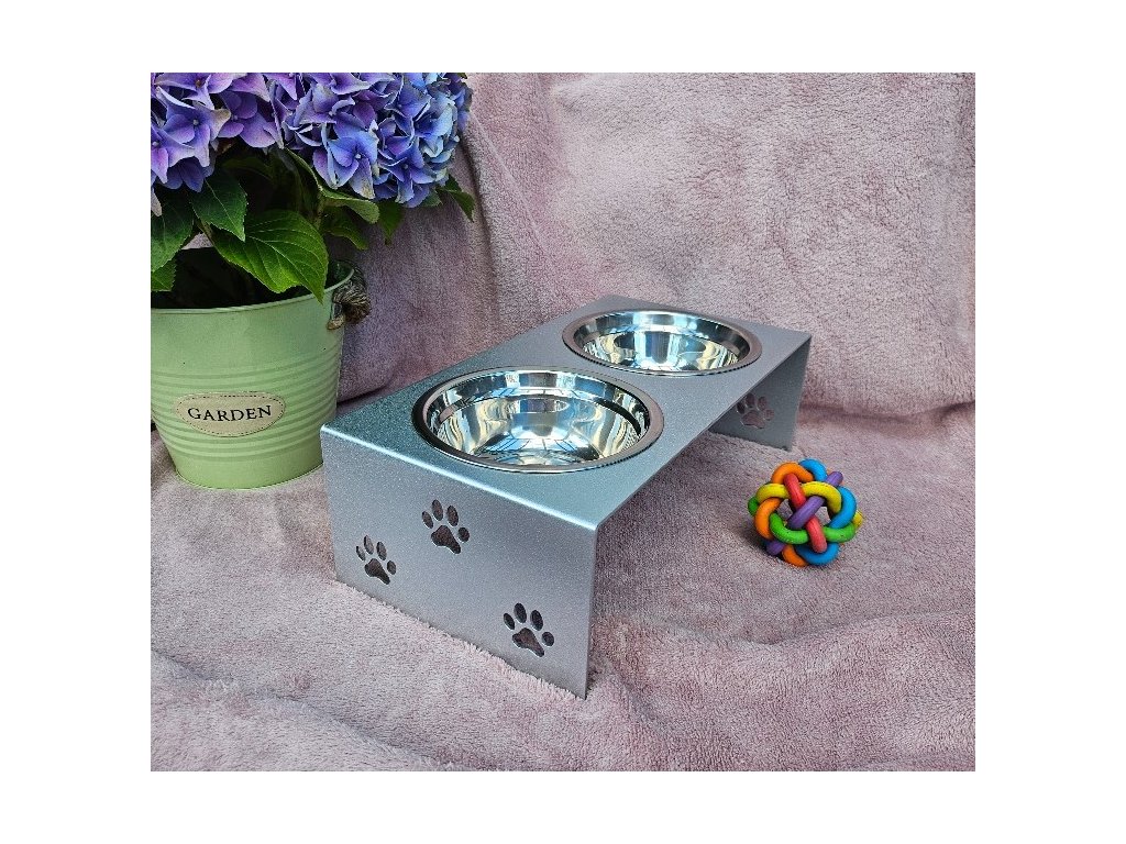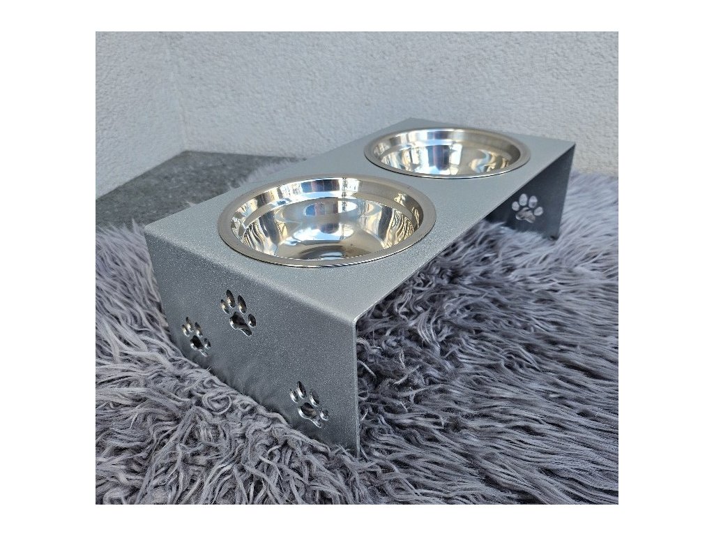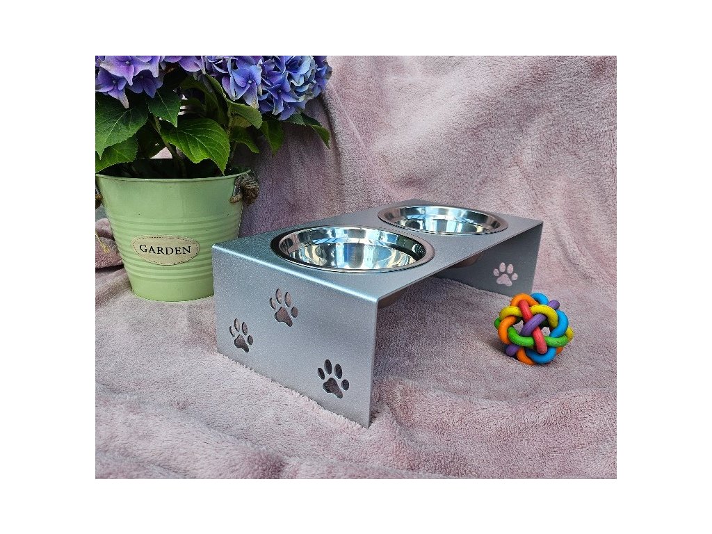 HafBar „S pacičkami“ – kovový stojan na dvě misky pro psy, velikost S (stříbrná)