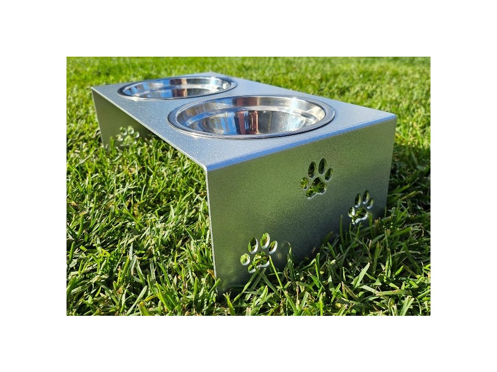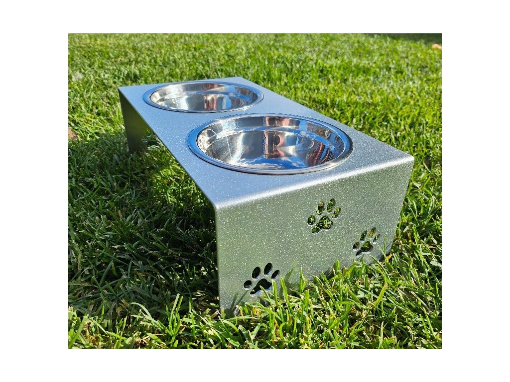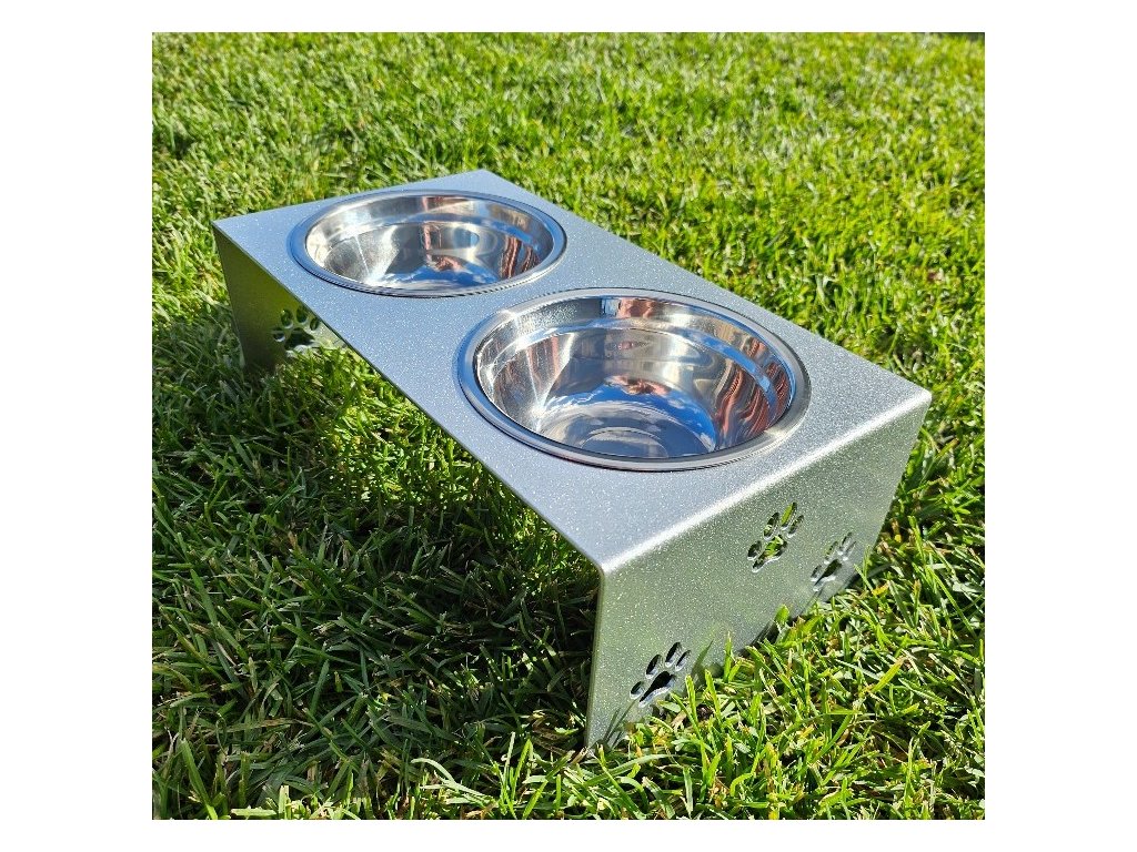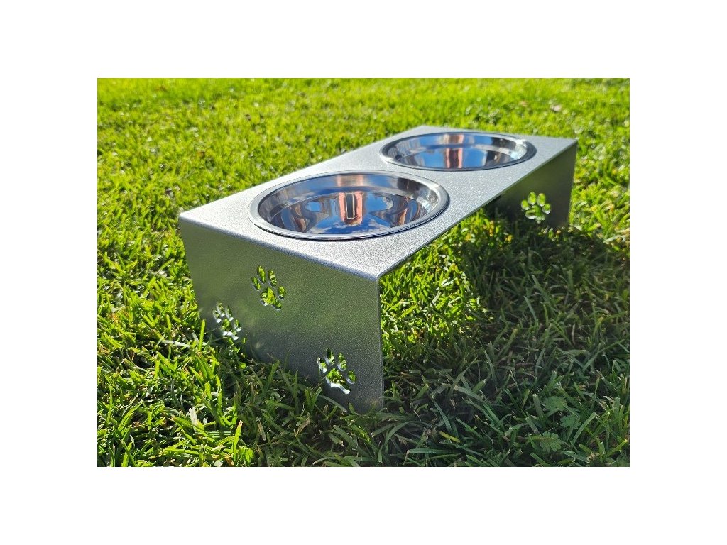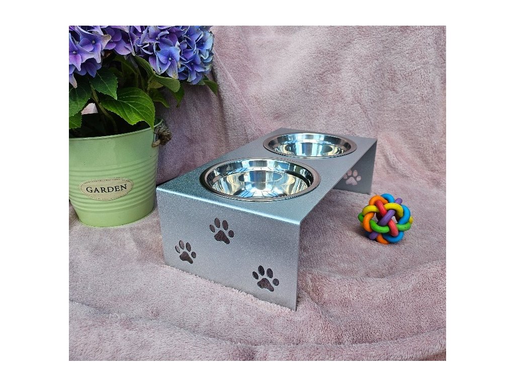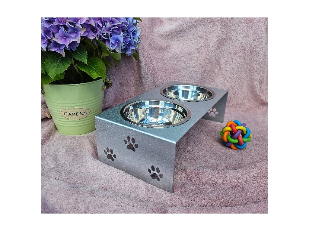 HafBar „S pacičkami“ – kovový stojan na dvě misky pro psy, velikost S (stříbrná)