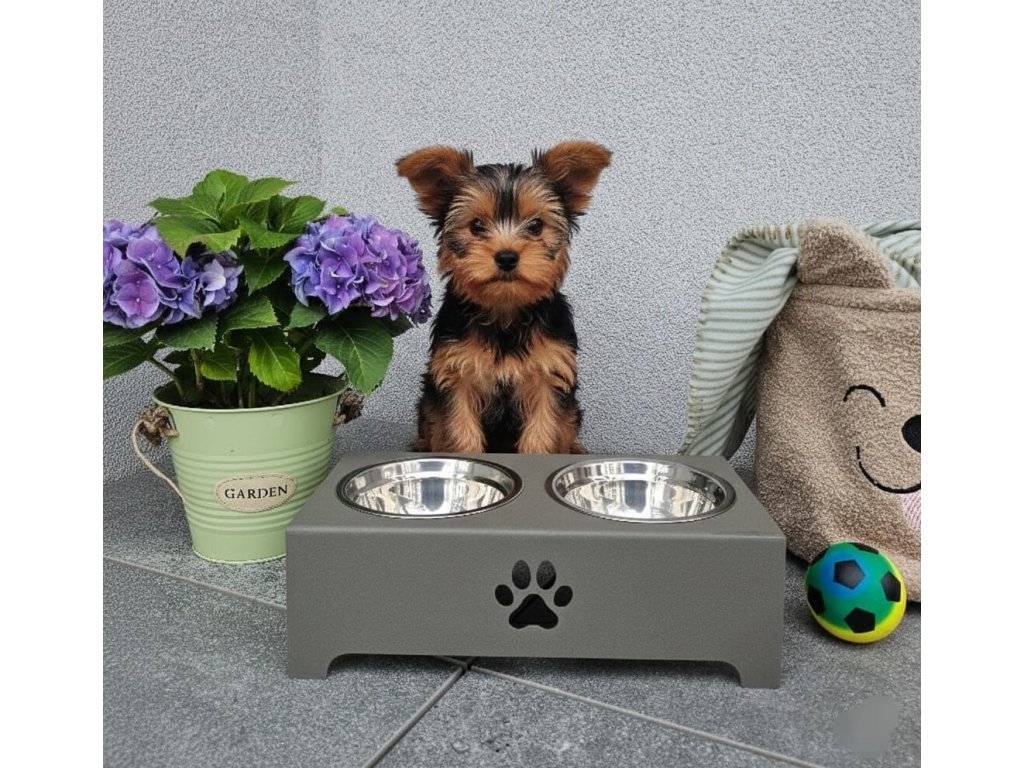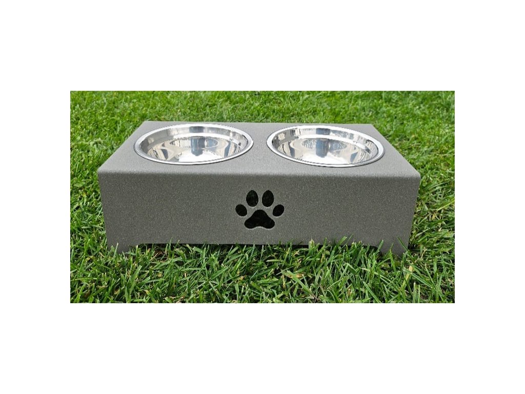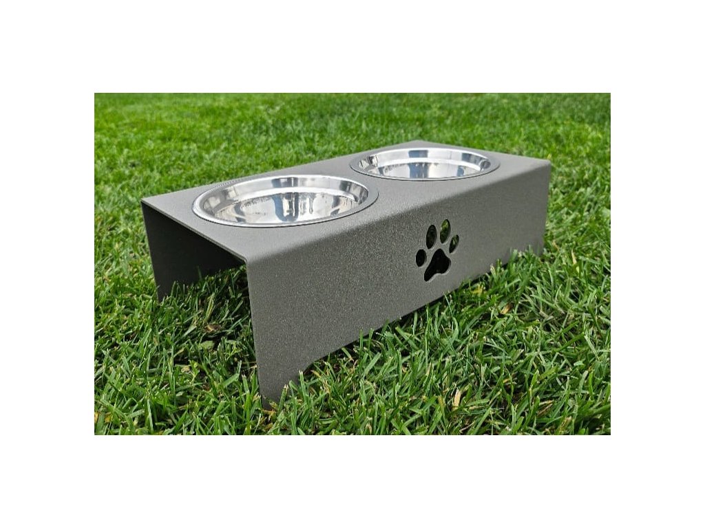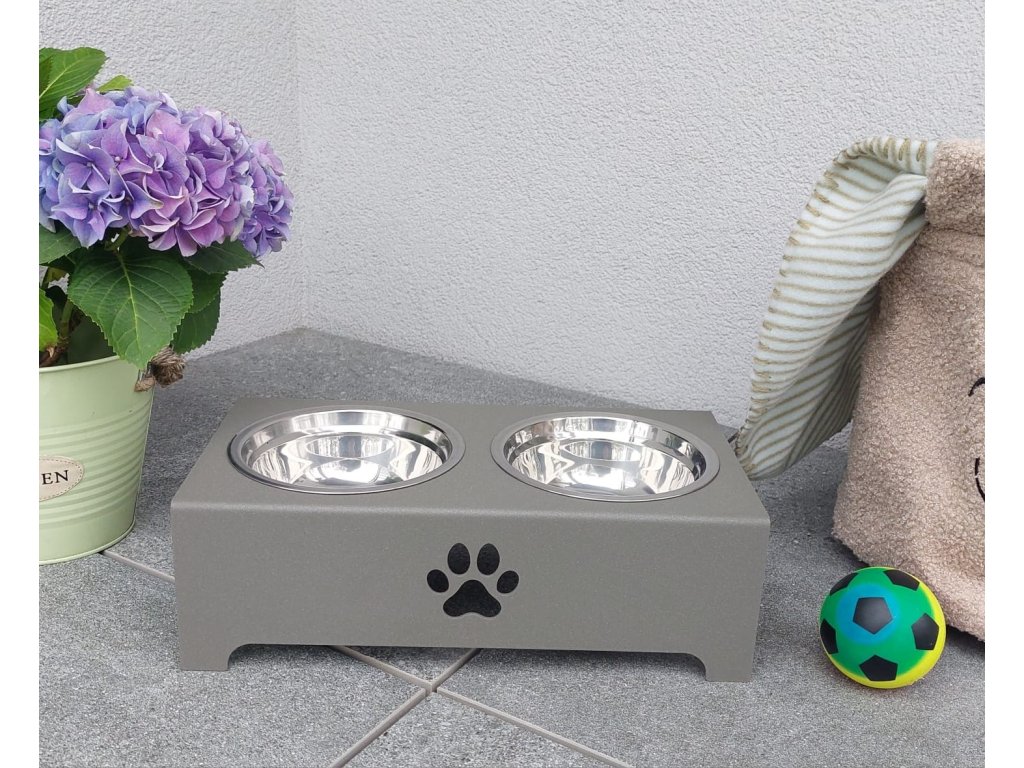 HafBar „S pacičkou“ – kovový stojan na dvě misky pro psy, velikost S (zeleno-šedá)