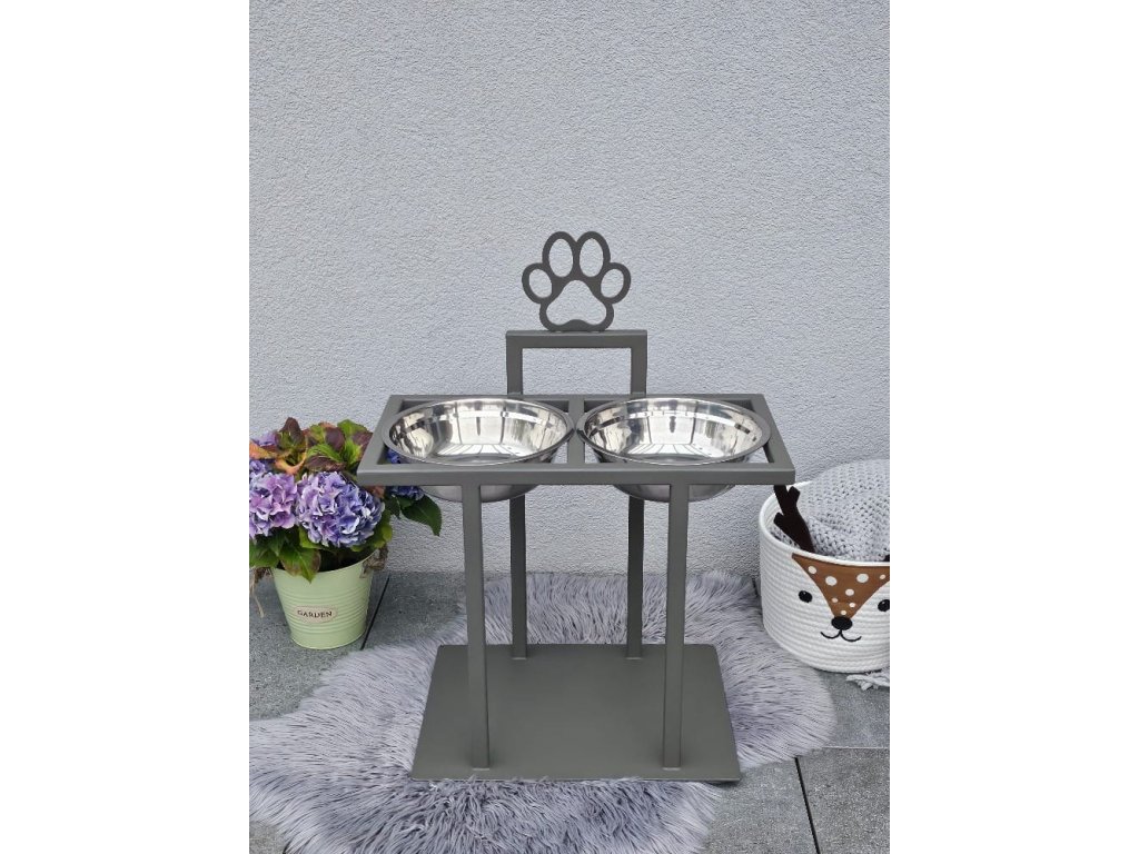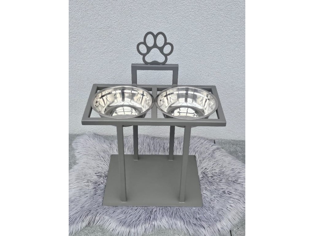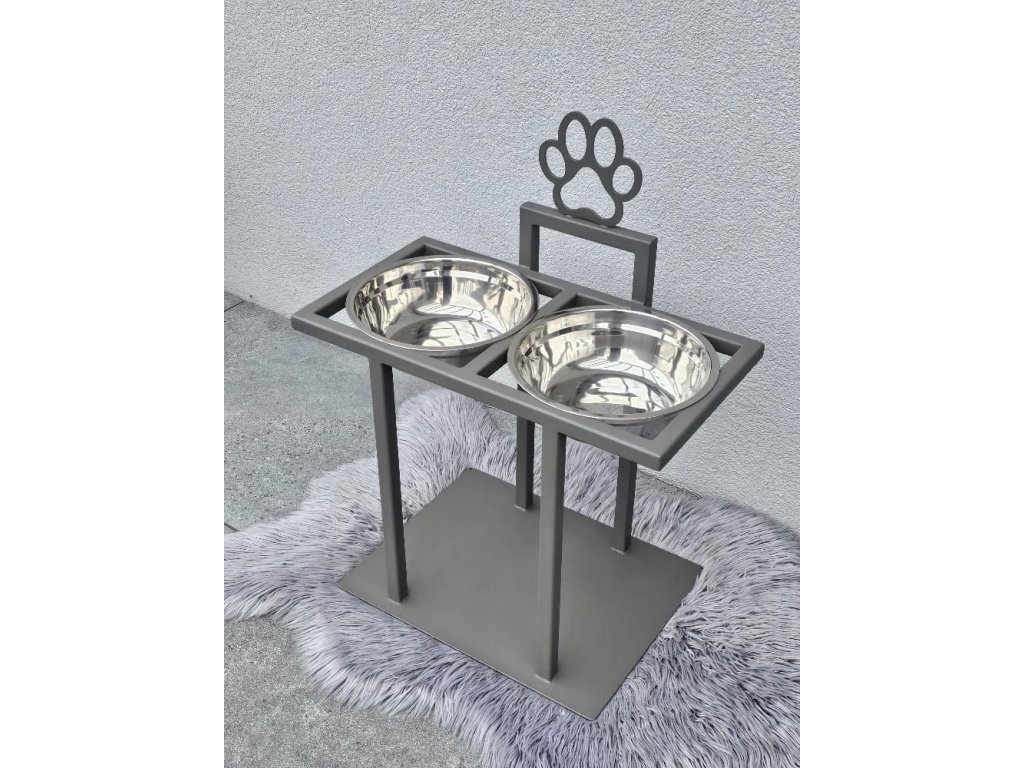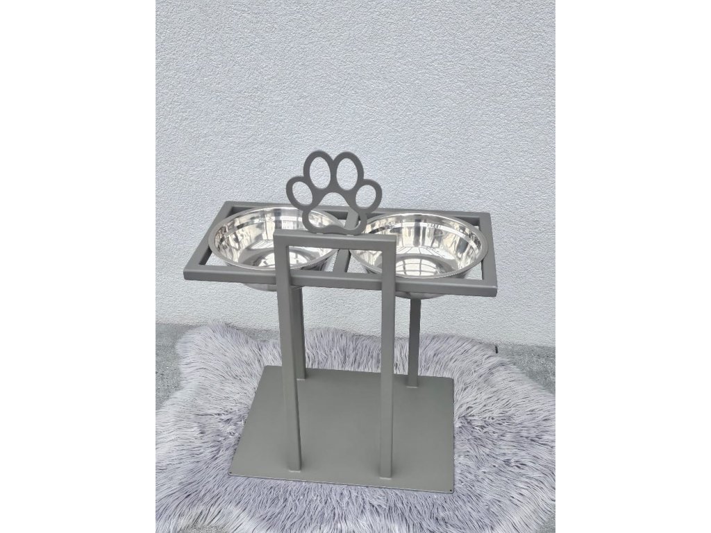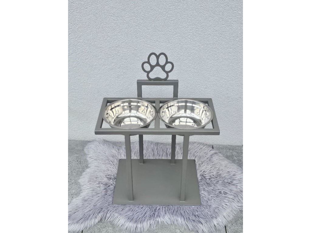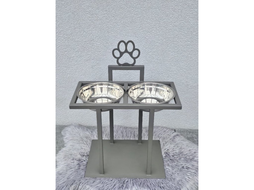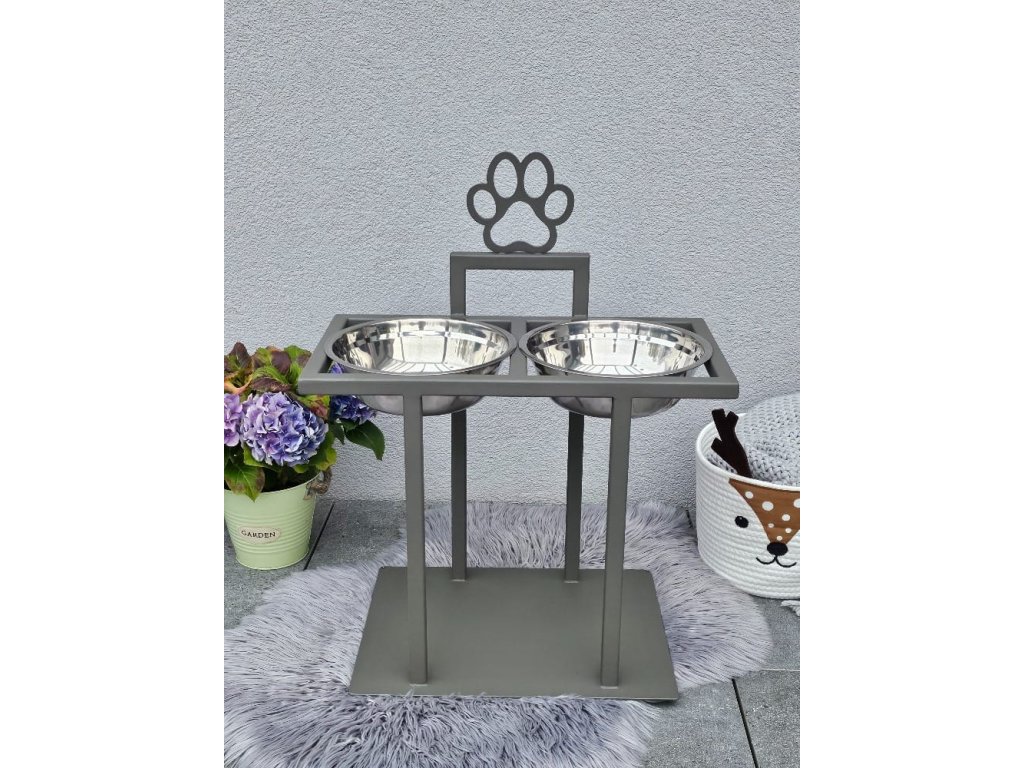 Designový kovový stojan na misky HafBar. Jeklový vzhled zdobený pacičkou, pevná konstrukce a bezpečný materiál pro pohodlné a zdravé stolování vašeho pejska. Barva - zeleno-šedá.