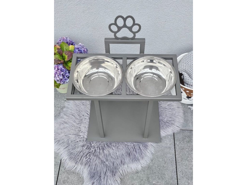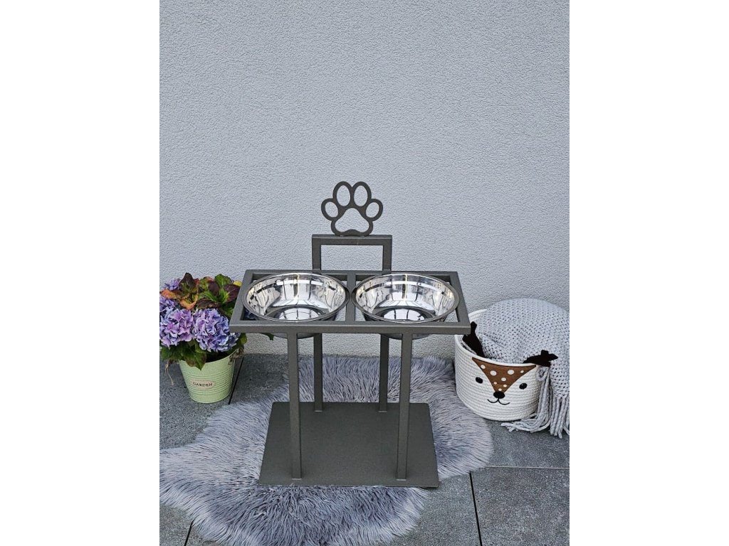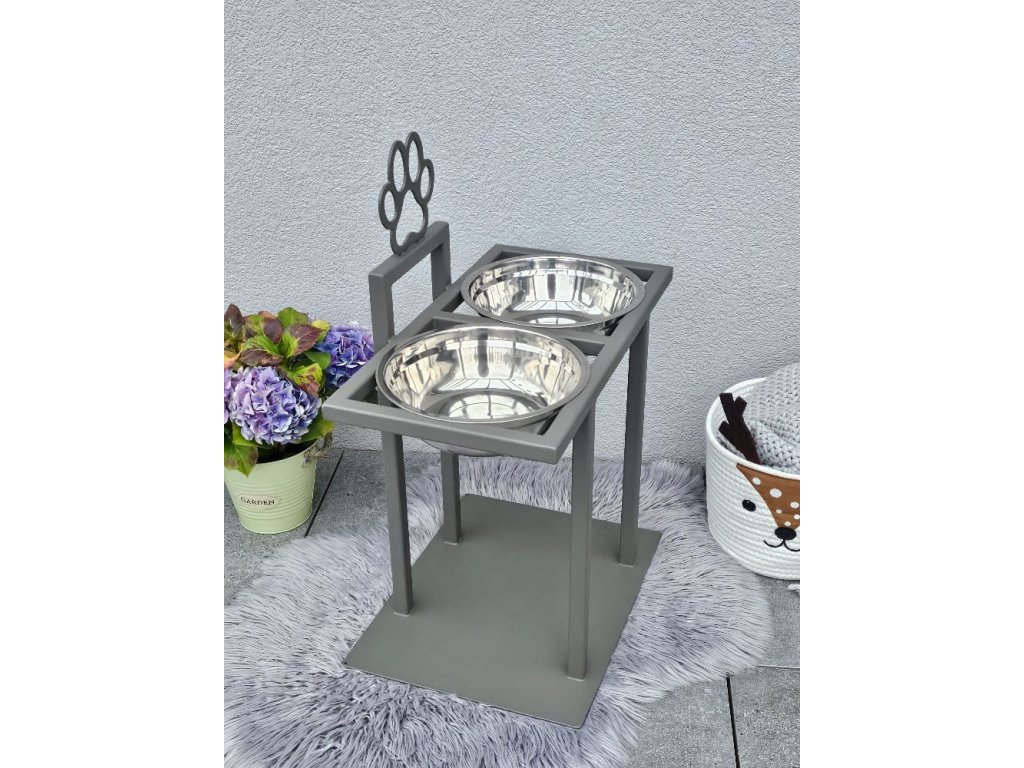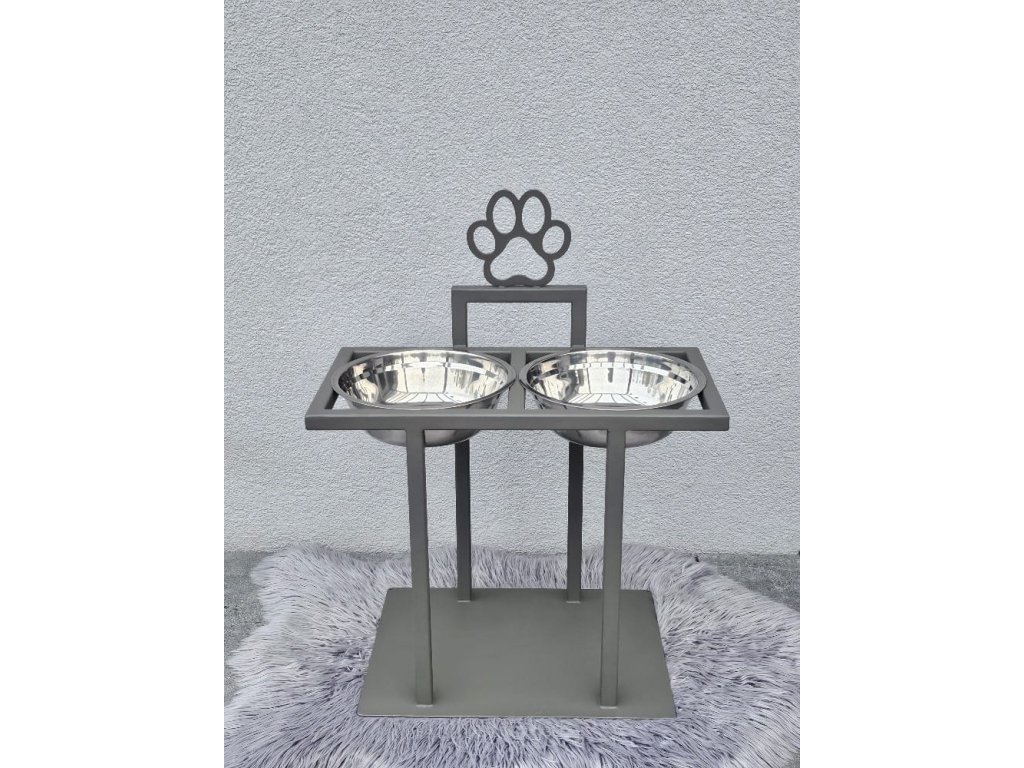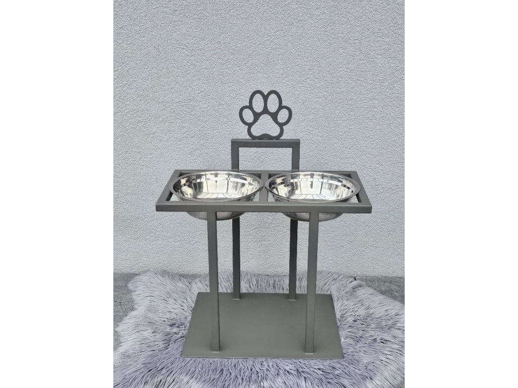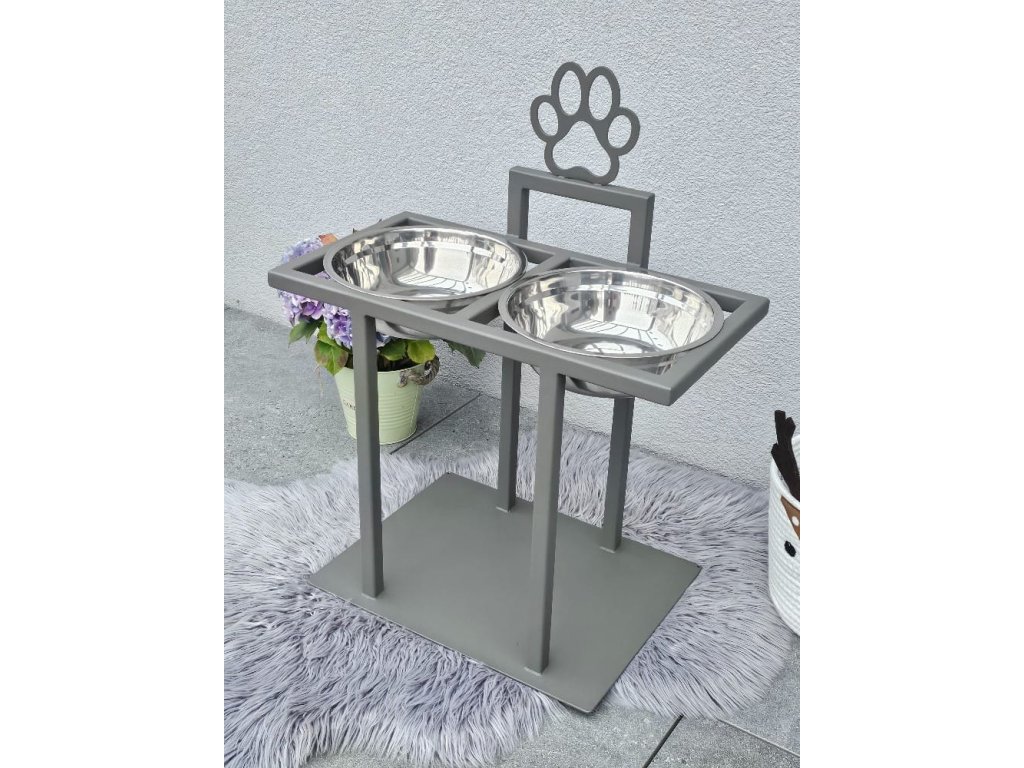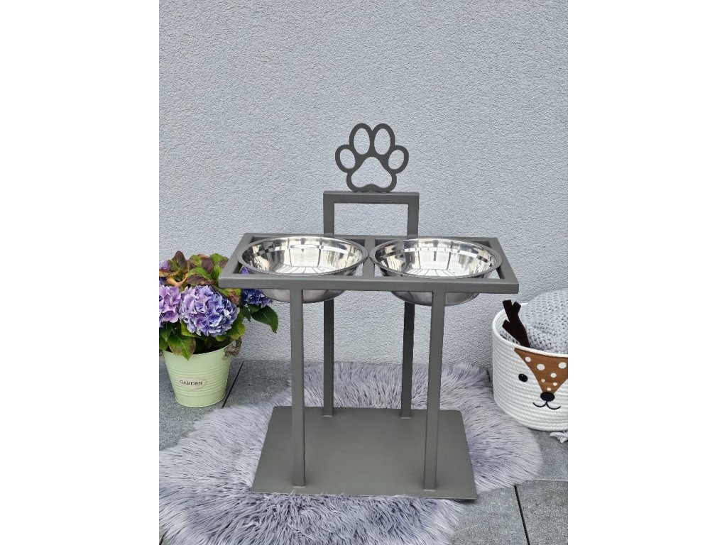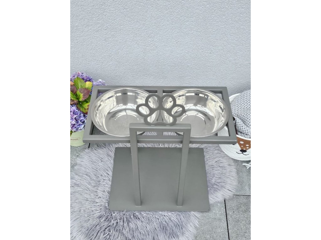 Designový kovový stojan na misky HafBar. Jeklový vzhled zdobený pacičkou, pevná konstrukce a bezpečný materiál pro pohodlné a zdravé stolování vašeho pejska. Barva - zeleno-šedá.