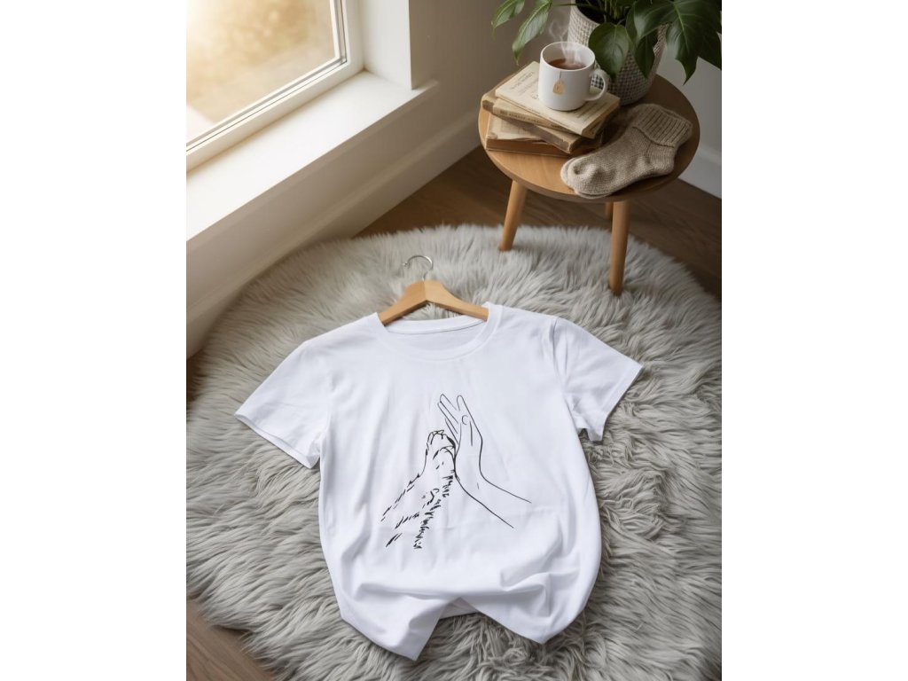 Bílé dámské tričko s potiskem psí tlapička a ruka, vyrobeno ze 100% bavlny. Jednoduché, ale stylové tričko s krátkým rukávem a kulatým výstřihem. Je skvělé pro volnočasové aktivity s vaším psím miláčkem.