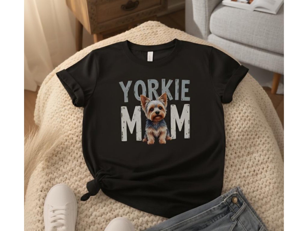 Černé dámské tričko s potiskem "Yorkie MOM", vyrobeno ze 100% bavlny. Jednoduché, ale stylové tričko s krátkým rukávem a kulatým výstřihem. Je skvělé pro volnočasové aktivity s vaším psím miláčkem.
