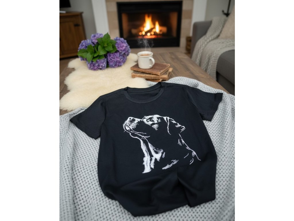 Černé dámské tričko s potiskem labradora, vyrobeno ze 100% bavlny. Jednoduché, ale stylové tričko s krátkým rukávem a kulatým výstřihem. Je skvělé pro volnočasové aktivity s vaším psím miláčkem.