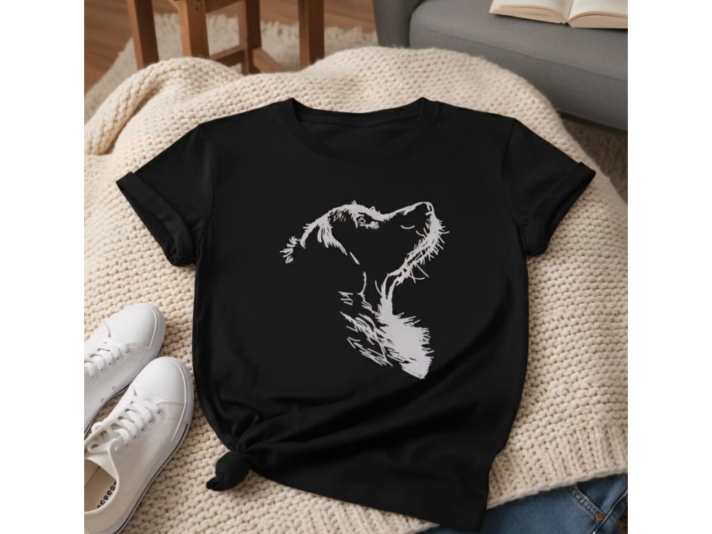 Černé dámské tričko s potiskem psí hlava, vyrobeno ze 100% bavlny. Jednoduché, ale stylové tričko s krátkým rukávem a kulatým výstřihem. Je skvělé pro volnočasové aktivity s vaším psím miláčkem.
