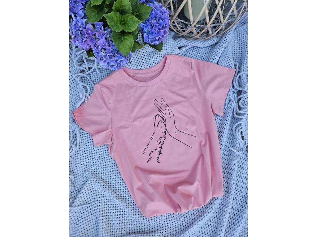 Růžové dámské tričko s potiskem psí tlapička a ruka, vyrobeno ze 100% bavlny. Jednoduché, ale stylové tričko s krátkým rukávem a kulatým výstřihem. Je skvělé pro volnočasové aktivity s vaším psím miláčkem.