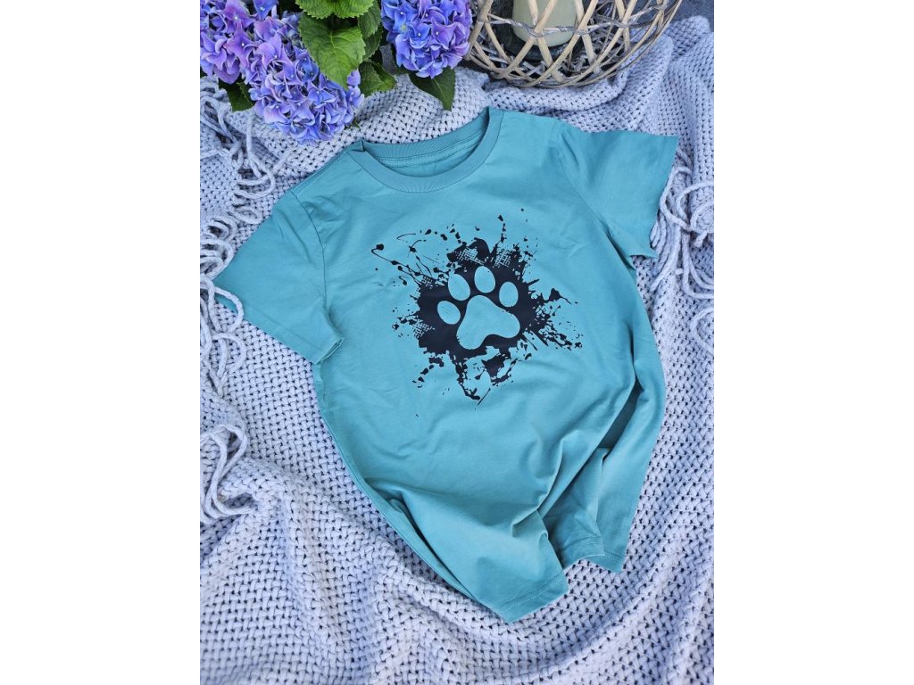 Zelené dámské tričko s potiskem psí tlapičky, vyrobeno ze 100% bavlny. Jednoduché, ale stylové tričko s krátkým rukávem a kulatým výstřihem. Je skvělé pro volnočasové aktivity s vaším psím miláčkem.