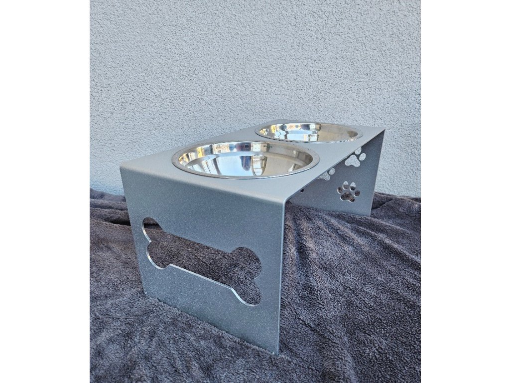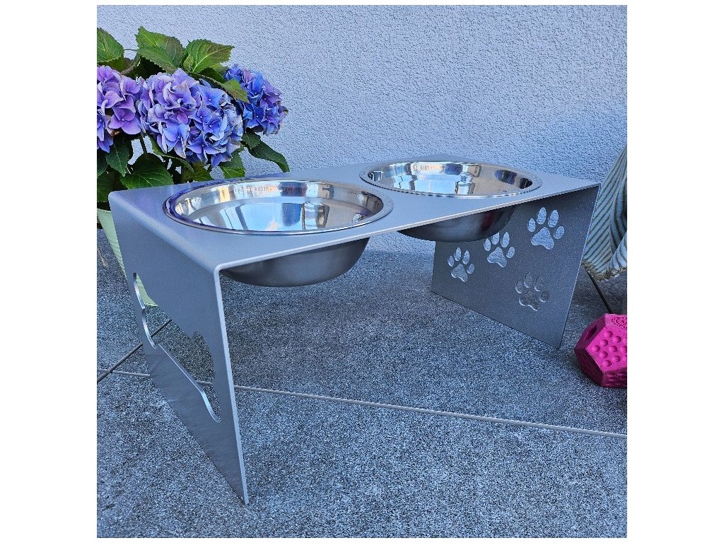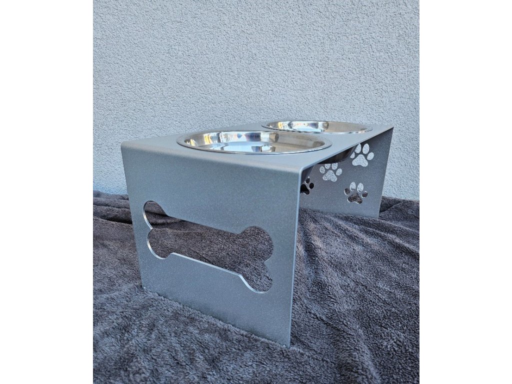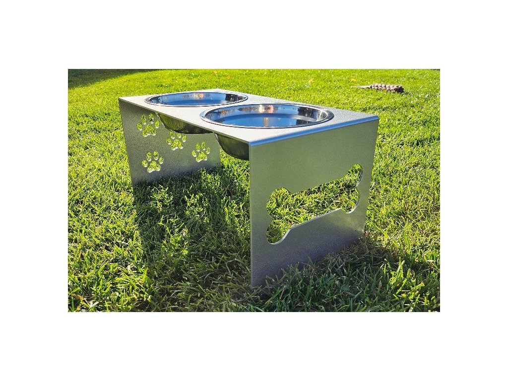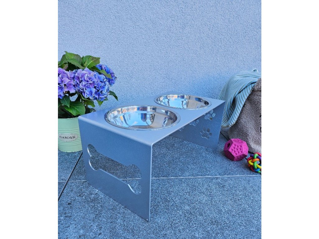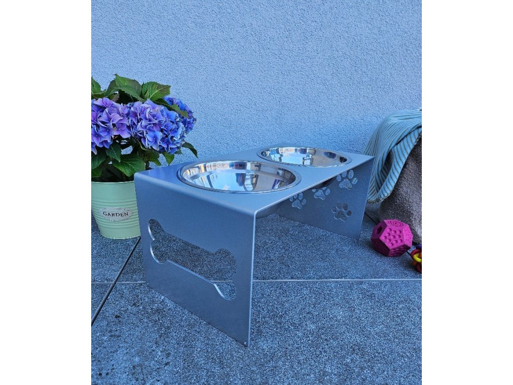 HafBar „Kost+pacičky“ – kovový stojan na dvě misky pro psy, velikost M (stříbrná)