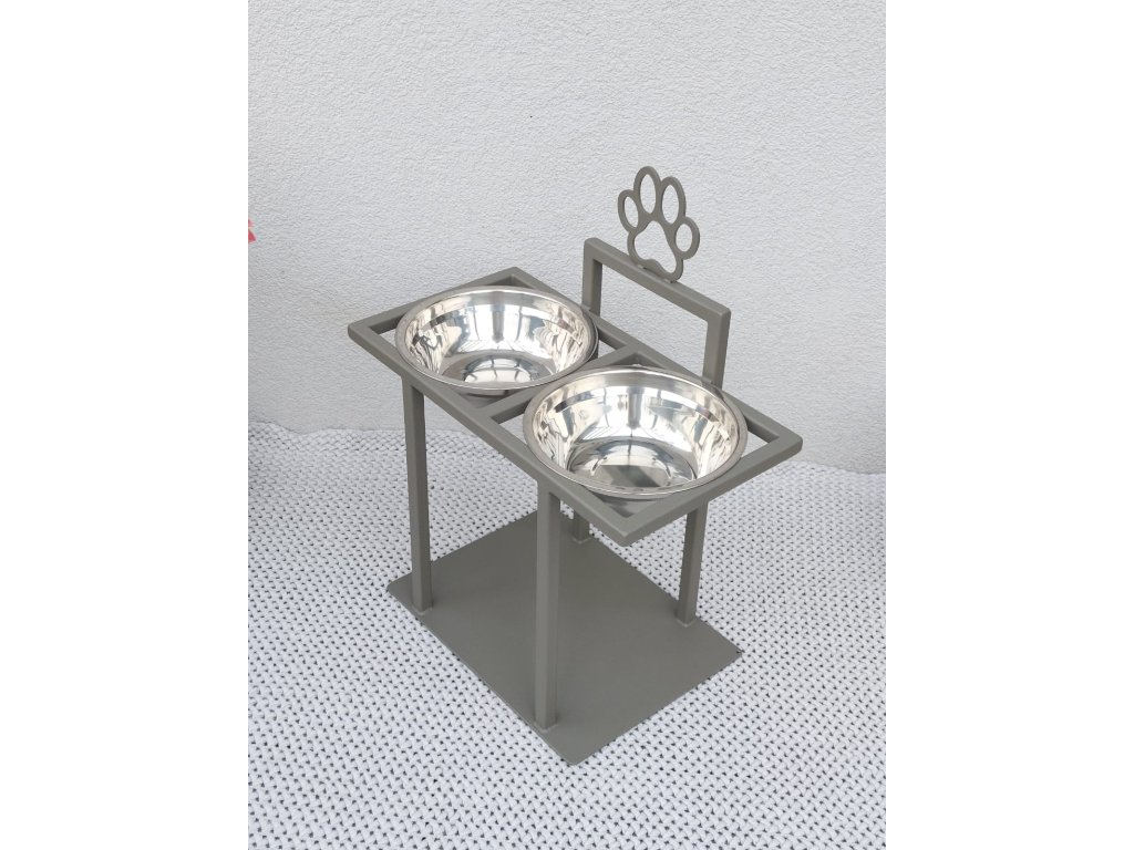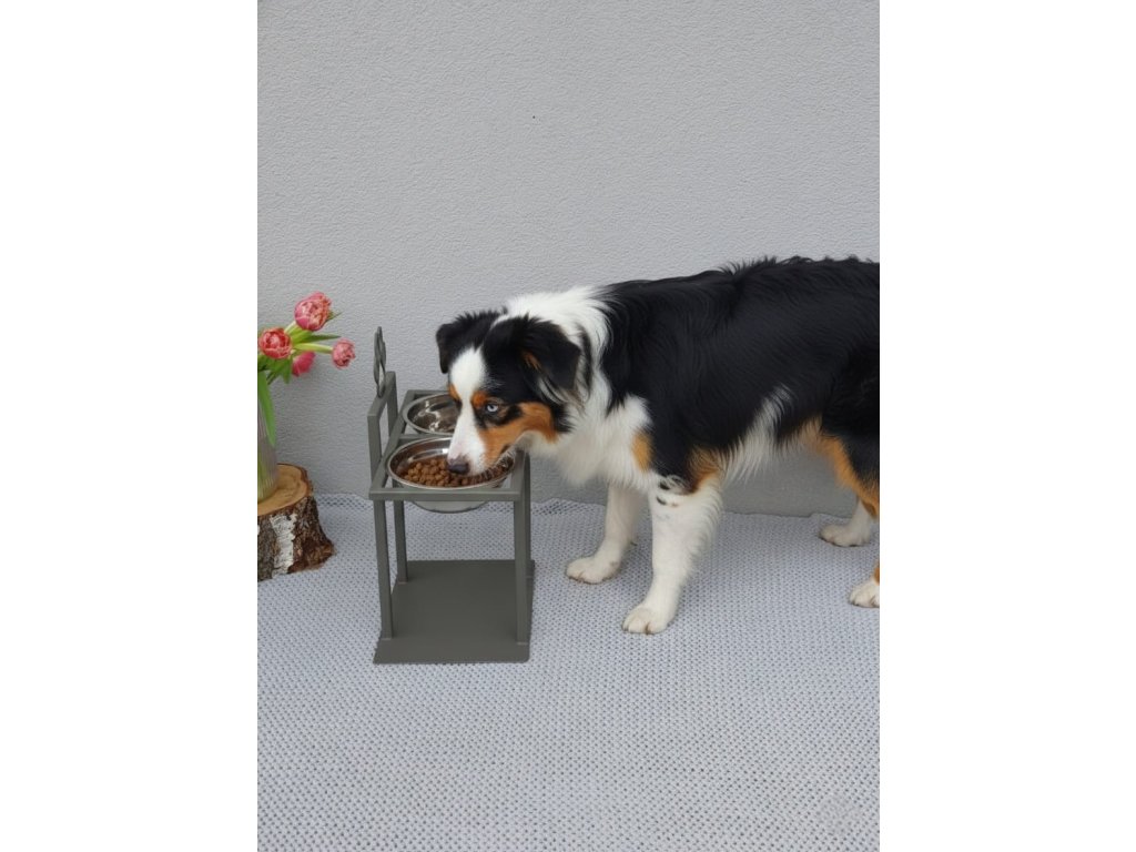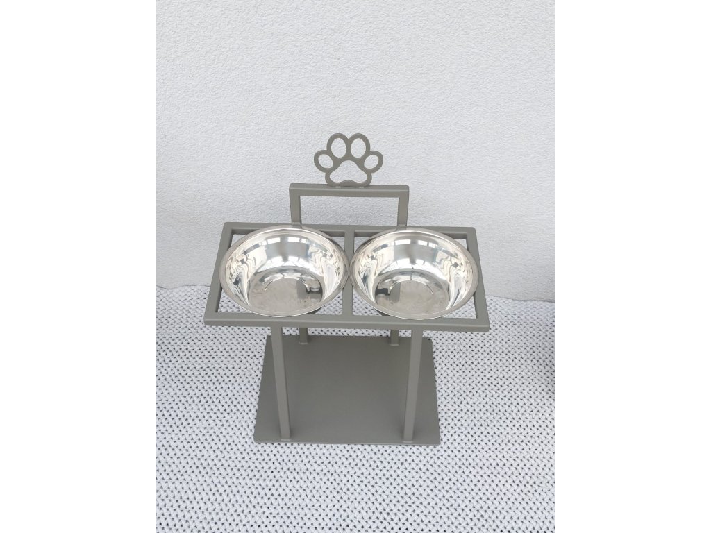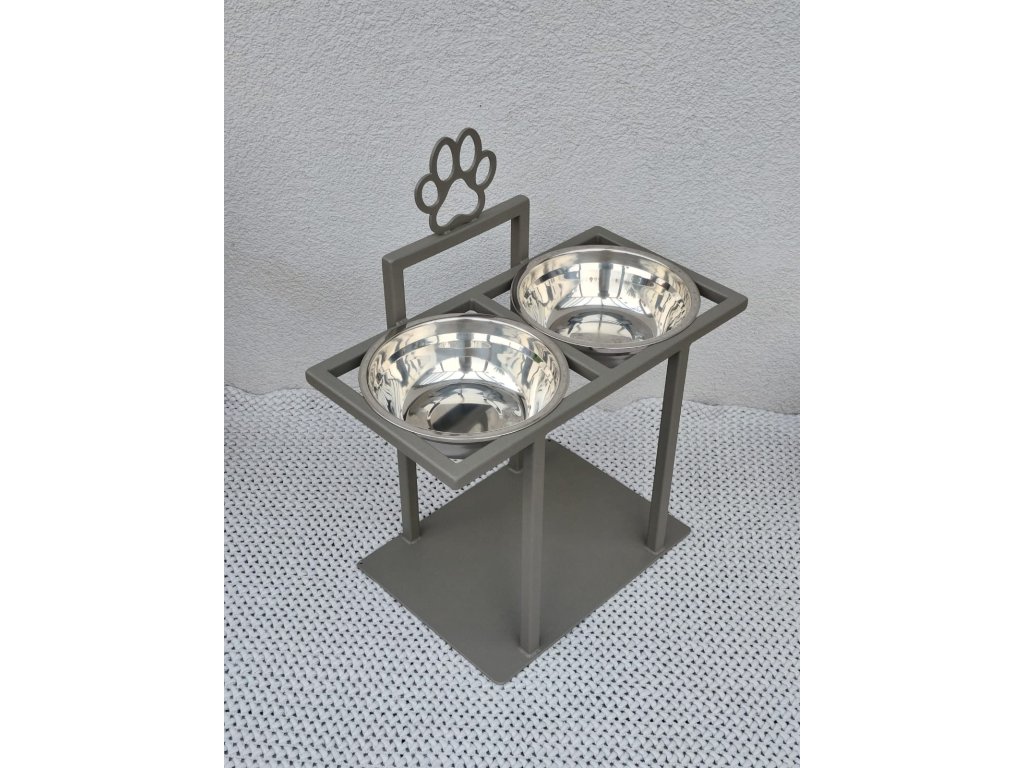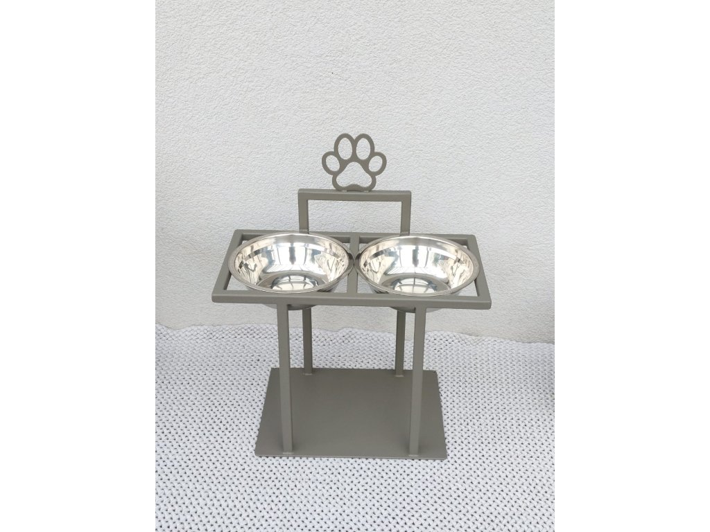 Designový kovový stojan na misky HafBar. Jeklový vzhled zdobený pacičkou, pevná konstrukce a bezpečný materiál pro pohodlné a zdravé stolování vašeho pejska. Barva - zeleno-šedá.