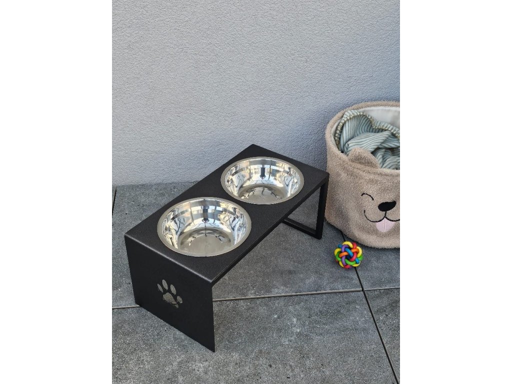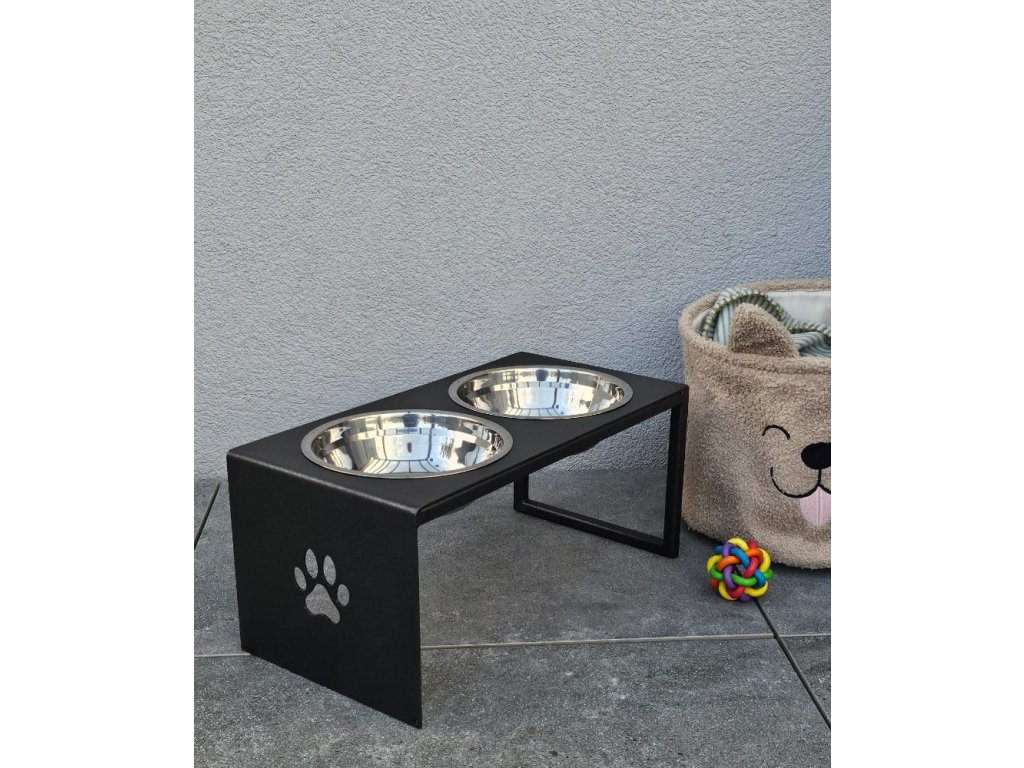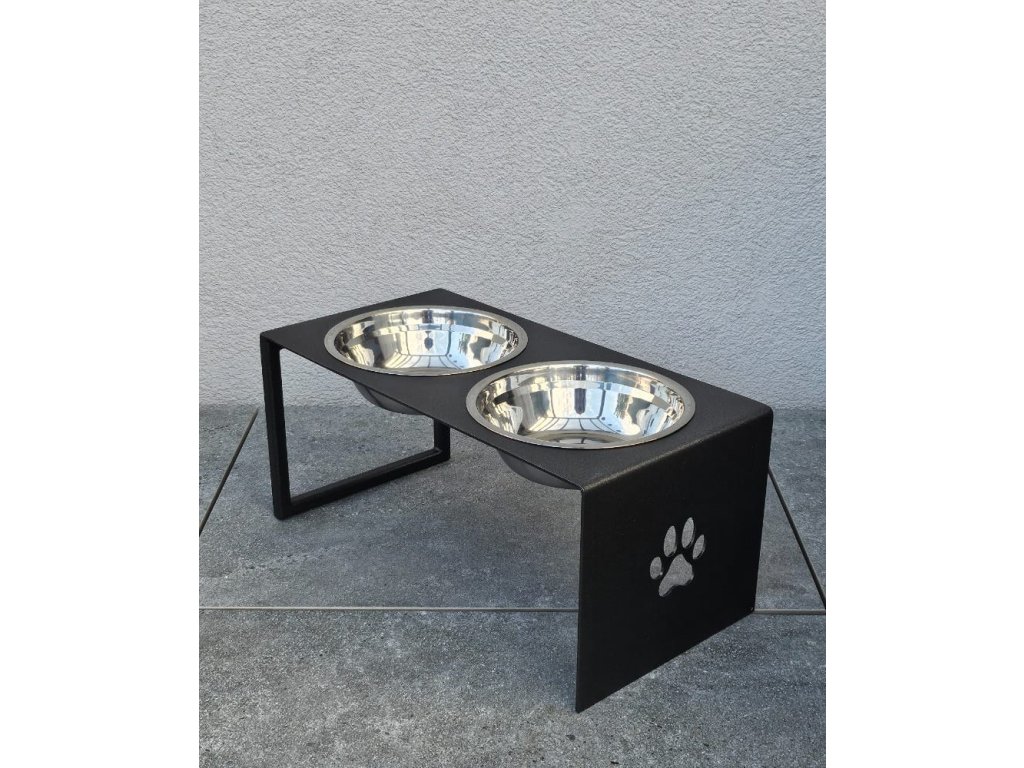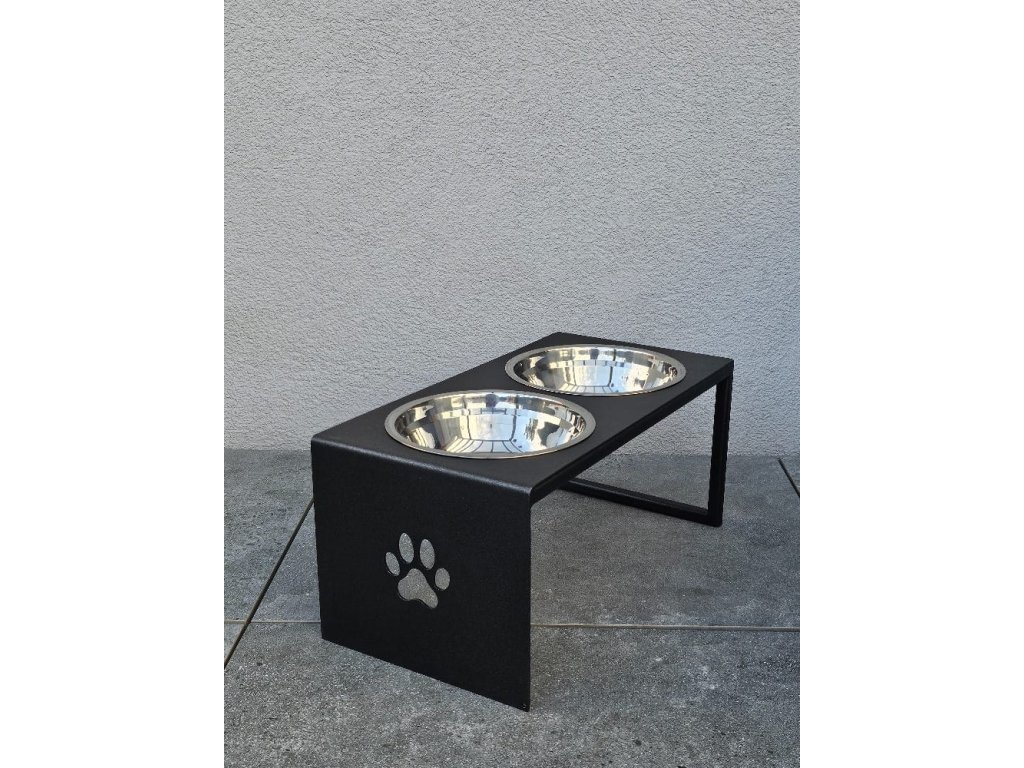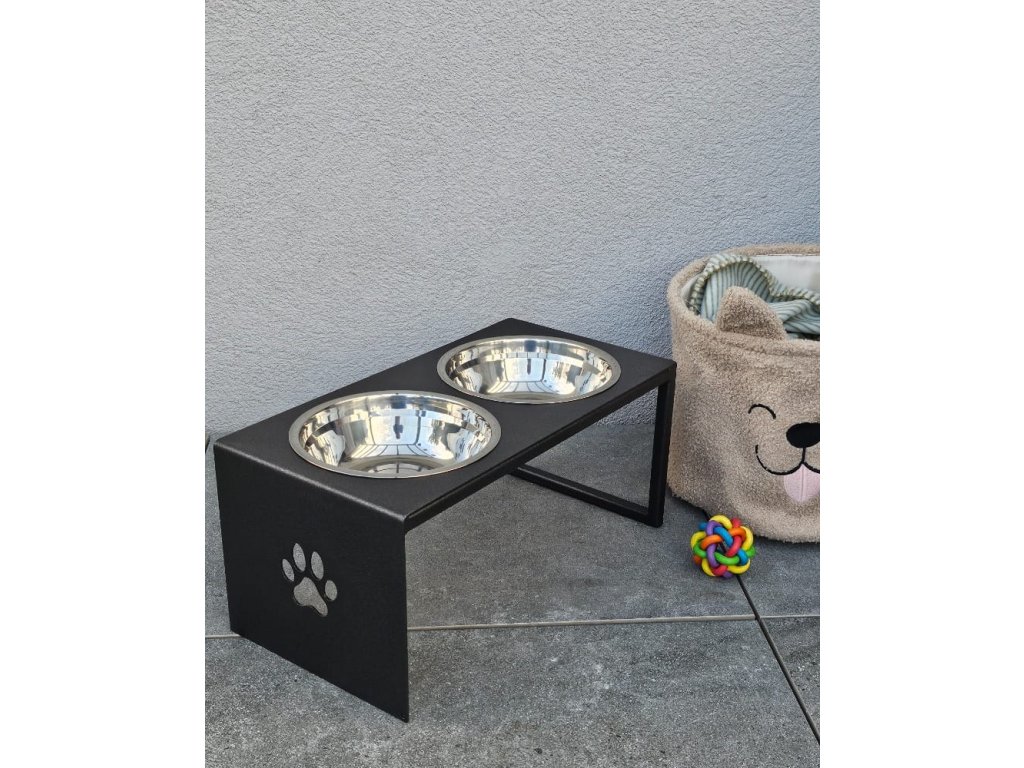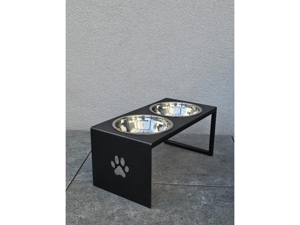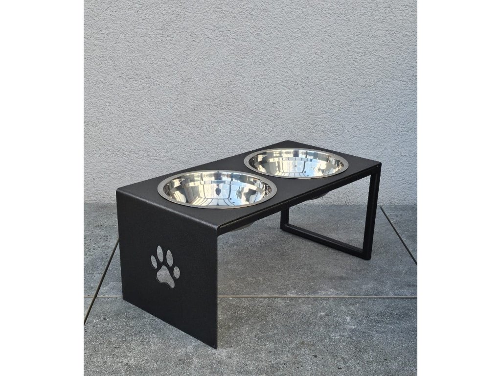 Designový kovový stojan s motivem pacičky. Ručně vyrobený v ČR pro zdravé a pohodlné krmení středních plemen. Barva - kovářská.