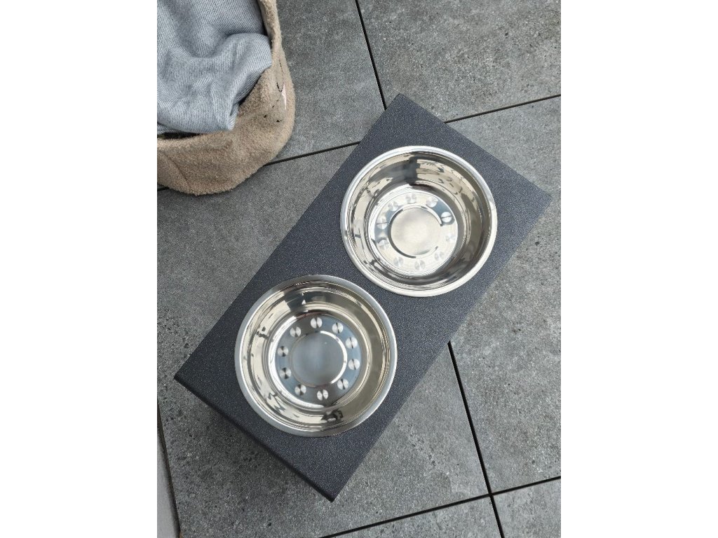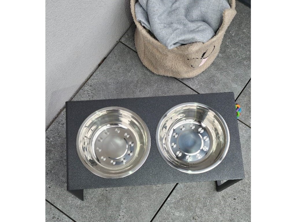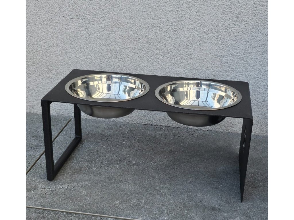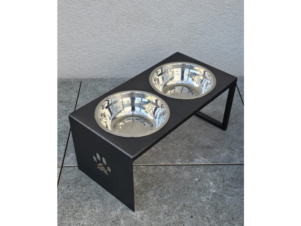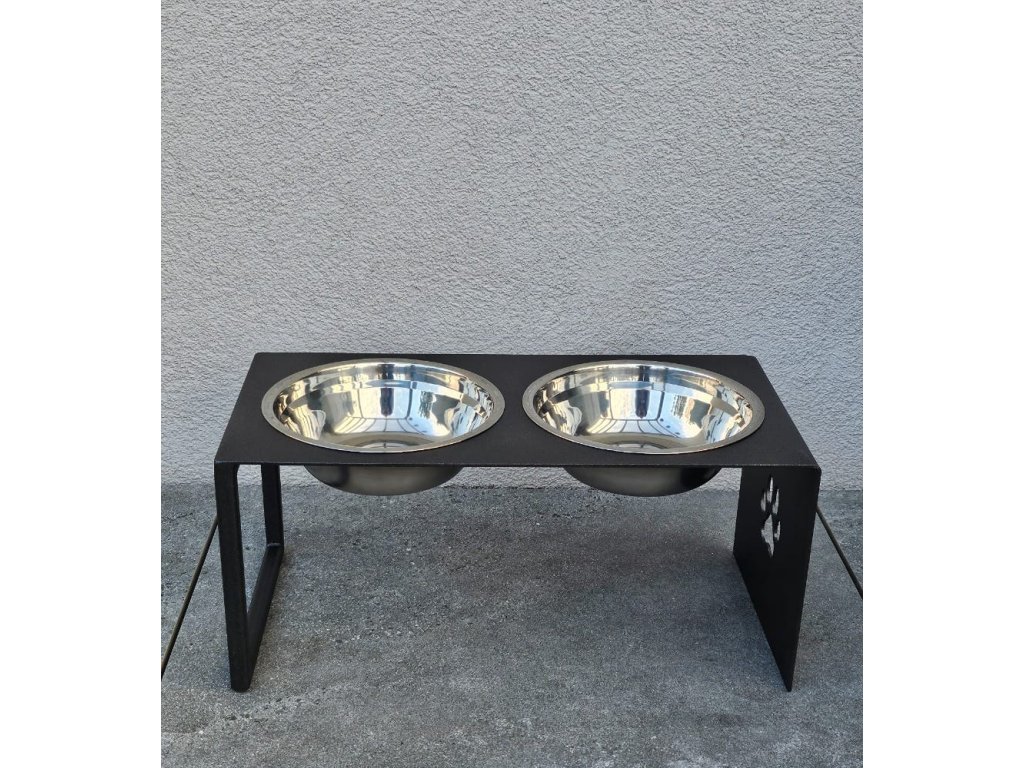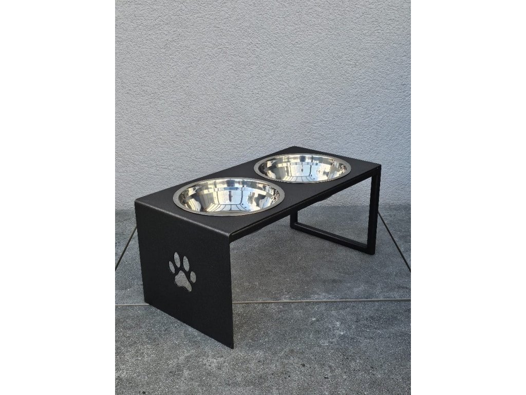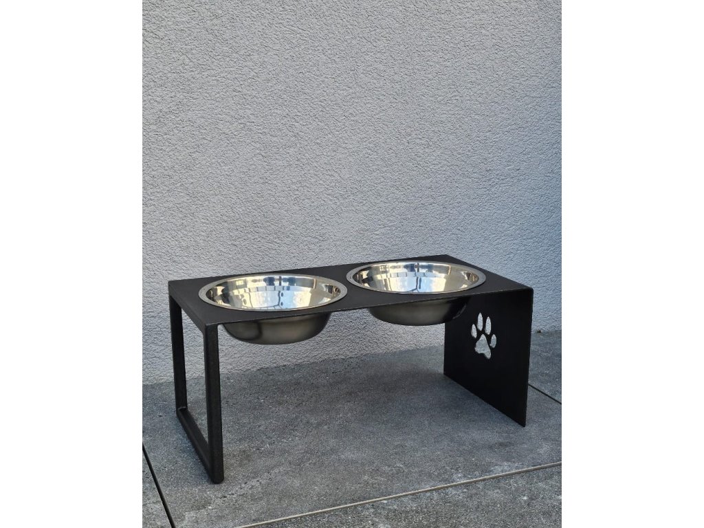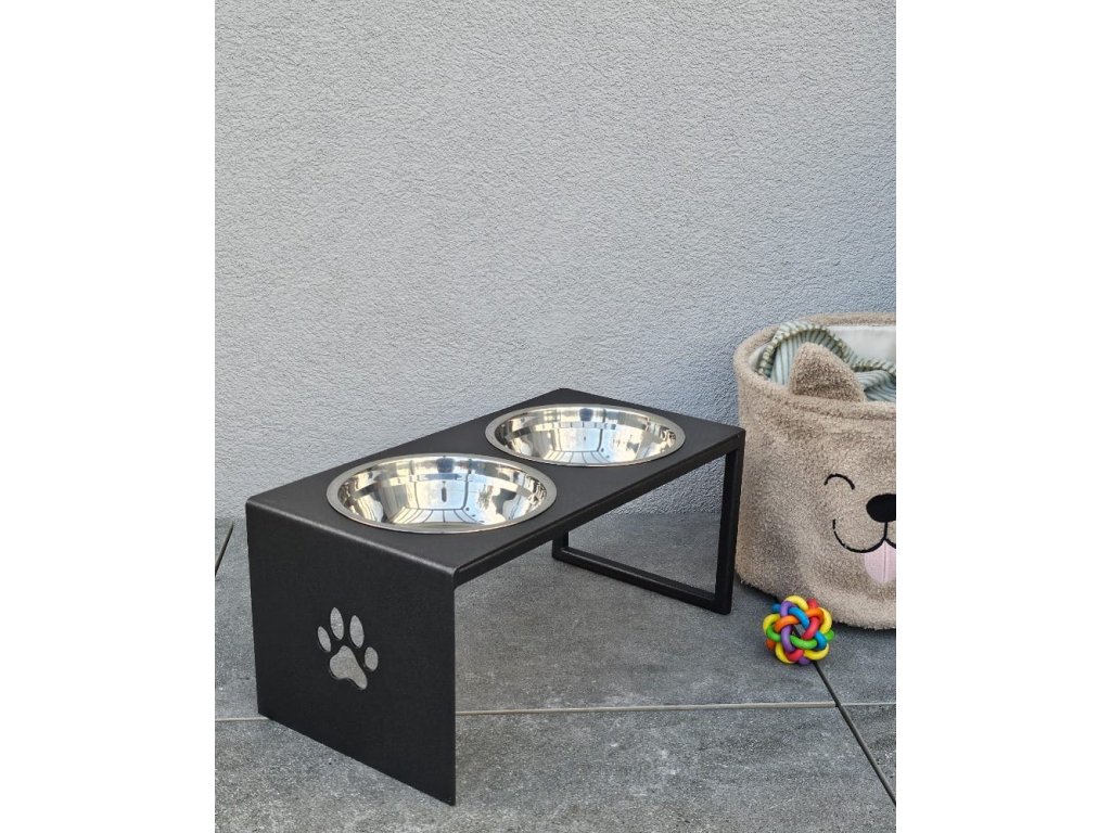 Designový kovový stojan s motivem pacičky. Ručně vyrobený v ČR pro zdravé a pohodlné krmení středních plemen. Barva - kovářská.