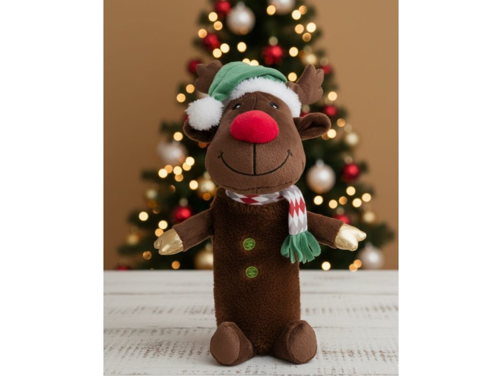 Plyšový vánoční sob s plastovou lahví uvnitř z limitované kolekce Vánoce 2025. Sob je vyrobený z materiálu plyš + polyester + plastová lahev uvnitř. Sob má hnědou barvu. Je vhodný pro střední a velká plemena. Velikost hračky je 45 cm. Hračka je s křupavým zvukem.